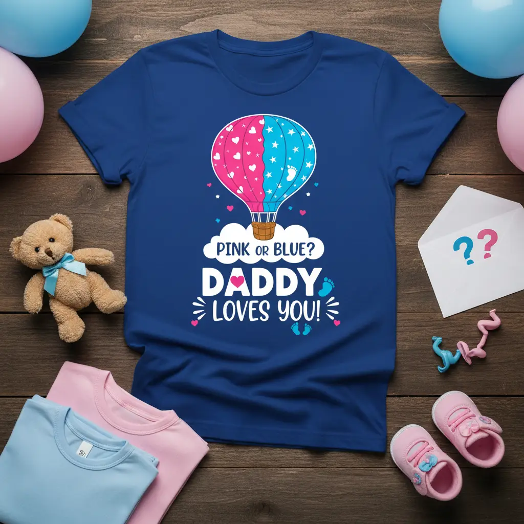 Pick from Black, Navy, Royal, Dark Heather, Red, and White to match your mood and wardrobe staples. Each colorway keeps the PINK OR BLUE? DADDY LOVES YOU! design clear and photo-ready for everyday wear.