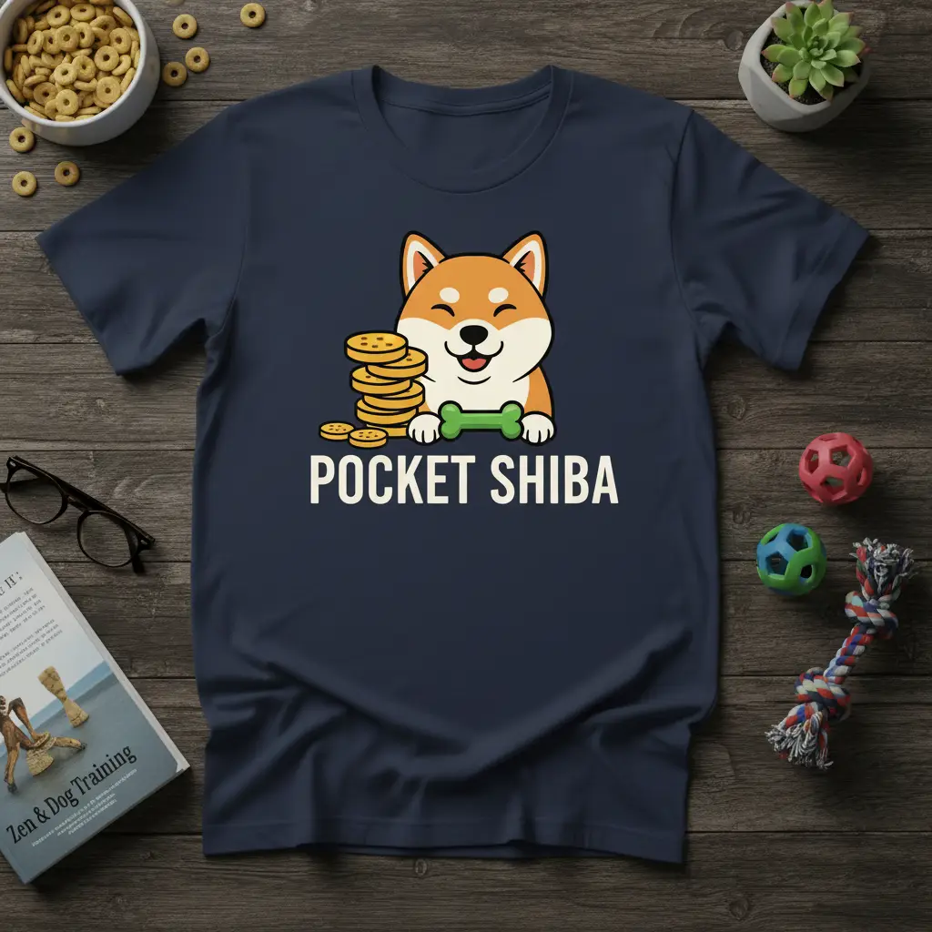 The Pocket Shiba t-shirt features an endearing graphic that showcases a cute, cartoon-style Shiba Inu. This adorable canine companion is depicted with a joyful expression, holding a bright green bone in its mouth. Surrounding the dog are stacks of golden coins, adding a touch of whimsy and hinting at the breed’s spirited nature. The bold, white text “POCKET SHIBA” is clearly visible, making the design instantly recognizable and appealing to fans of the breed.