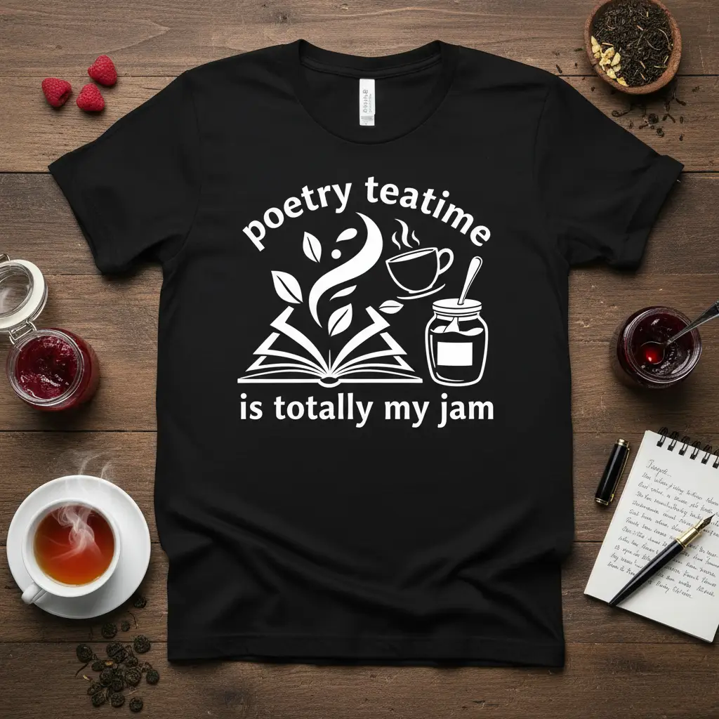 Poetry teatime is totally my jam, and this t-shirt is the perfect way to express that delightful sentiment. It’s designed for those who find solace and joy in the pages of a good book, accompanied by a warm cup of tea and perhaps a dollop of sweet jam. This garment is more than just apparel; it’s a statement of your passions and a cozy embrace for your everyday adventures. Wear your love for literature and comfort with pride.