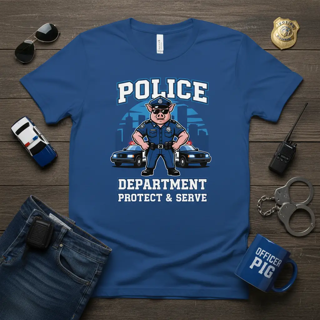 POLICE DEPARTMENT PROTECT & SERVE on this unique and eye-catching t-shirt is designed for those who appreciate our law enforcement officers and enjoy a touch of humor. This graphic tee features a whimsical cartoon pig dressed in a police uniform, standing proudly between two police cars with a cityscape in the background. It’s a fantastic way to express support for the police force while showcasing your fun side. The design combines a classic police motto with an unforgettable character, making it a standout piece for any casual wardrobe. Show your appreciation for the men and women who protect and serve our communities with this memorable apparel.