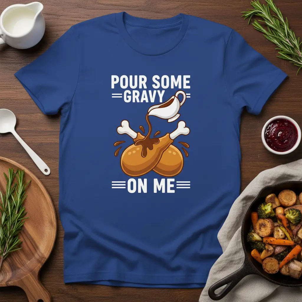 This t-shirt is more than just clothing; it’s a statement piece for the ultimate gravy enthusiast. The design features whimsical cartoon turkey legs being showered with rich, brown gravy, all while the bold text proclaims “Pour Some Gravy On Me.” It’s a delightful visual that perfectly encapsulates the joy and indulgence of Thanksgiving dinner, making it a must-have for anyone who loves to celebrate with food and humor.