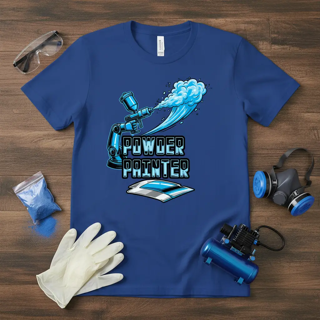 This tee celebrates the skill and dedication of powder coating professionals. The design features a stylized robotic spray gun in the act of applying vibrant blue powder, creating a dynamic visual that speaks to the craft. It’s the perfect way for anyone involved in the industry to express their love for their trade and connect with fellow enthusiasts.