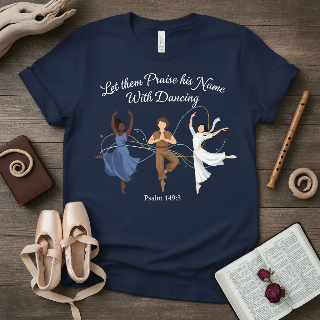Let them Praise his Name With Dancing Psalm 149:3 beautifully adorns this comfortable and inspiring t-shirt. This garment is designed for individuals who find spiritual connection and express their faith through the art of dance. The message serves as a reminder of the joy and freedom found in worship, encouraging everyone to lift their voices and spirits through movement. It’s more than just apparel; it’s a declaration of devotion and a celebration of God’s presence in our lives. Wear your faith proudly and let your spirit dance.