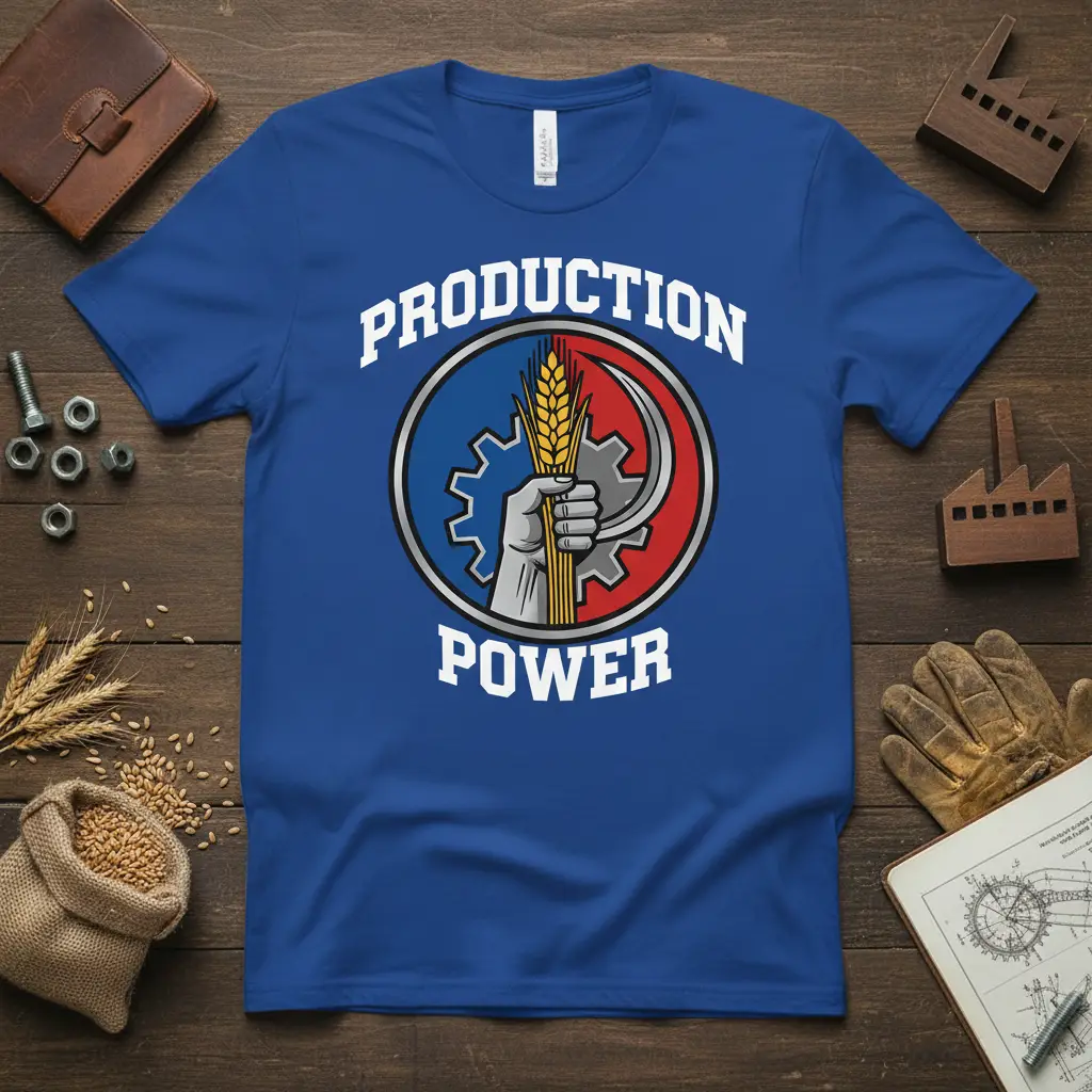Production Power is more than just a slogan; it’s a statement of intent and a symbol of collective strength. This t-shirt design captures the essence of industrial might and the enduring spirit of the working class. Featuring a powerful emblem that blends agricultural symbols with industrial tools, it speaks volumes about the value of labor and productivity. It’s a perfect way to showcase your dedication to the principles of unity and progress. Whether you’re attending a rally, participating in a labor event, or simply want to wear your beliefs, this shirt makes a strong visual statement.