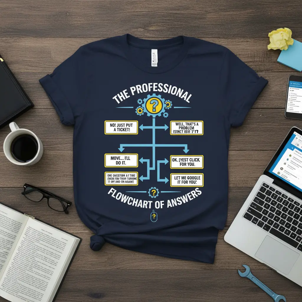 Looking for the perfect gift for the IT specialist, programmer, or tech-savvy friend in your life? This “The Professional Flowchart Of Answers” t-shirt is an ideal choice for birthdays, holidays, or just because. It’s a thoughtful and humorous present that is guaranteed to bring a smile to their face and become a fast favorite in their wardrobe. Give the gift of laughter and relatable tech humor.