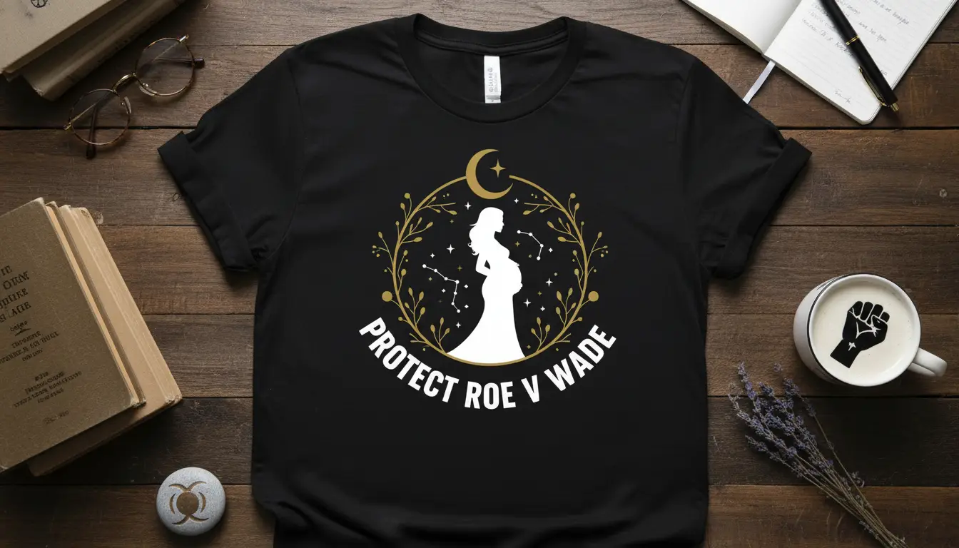 This thoughtfully designed t-shirt features the impactful slogan “Protect Roe V Wade” prominently displayed. The graphic includes a beautiful silhouette of a pregnant woman, symbolizing life and choice, encircled by a celestial motif of a moon, stars, and constellations. This imagery evokes a sense of cosmic justice and universal rights, making the message resonate deeply with supporters of reproductive freedom.