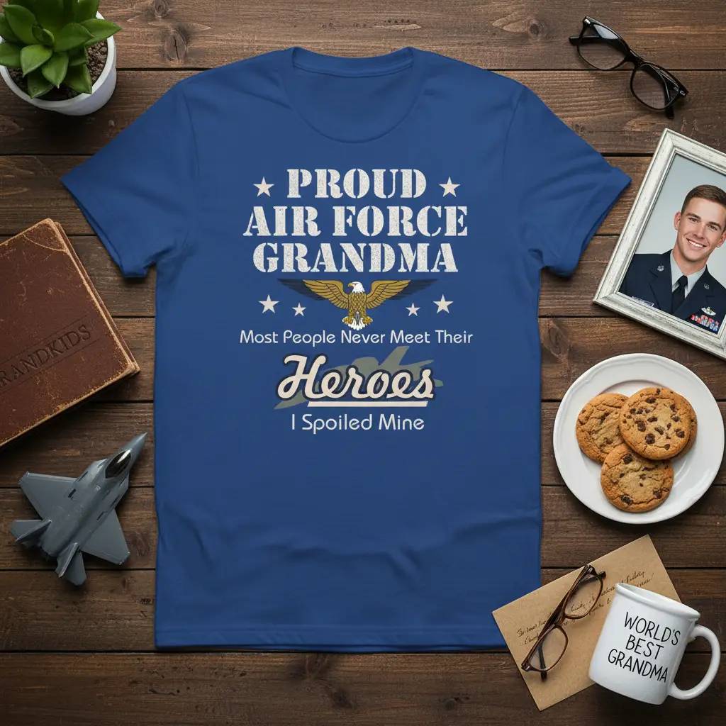 The heartwarming quote “Most People Never Meet Their Heroes, I Spoiled Mine” adds a personal and touching touch to the design. It reflects the unique privilege and immense joy of being a grandma to someone serving in the Air Force. This sentiment is beautifully rendered, making the t-shirt a conversation starter and a symbol of family pride. It’s a wearable tribute to your grandson or granddaughter’s service and your special relationship.