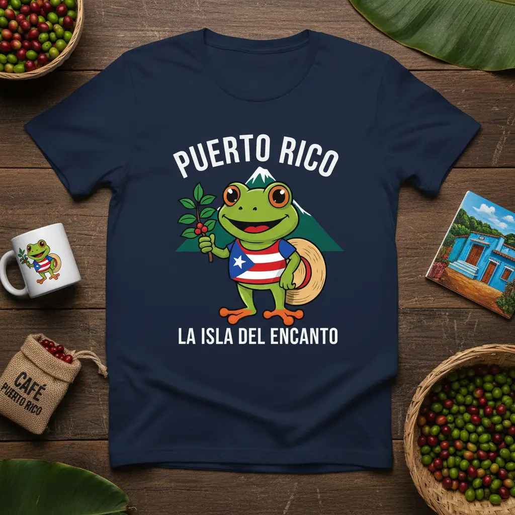 This eye-catching t-shirt prominently features the iconic “PUERTO RICO” and “LA ISLA DEL ENCANTO” text, beautifully framing a delightful coqui frog. The coqui, a beloved symbol of Puerto Rico, is depicted with a friendly smile, wearing a traditional straw hat and holding a branch laden with coffee berries, hinting at the island’s agricultural richness. This PUERTO RICO LA ISLA DEL ENCANTO design is further enhanced by subtle mountain graphics in the background, evoking the island’s natural beauty.