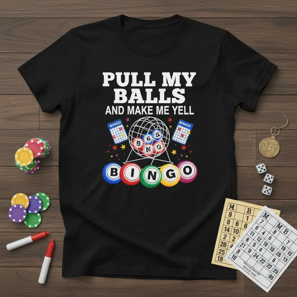 PULL MY BALLS AND MAKE ME YELL on this hilarious t-shirt, designed for the ultimate bingo enthusiast. This shirt perfectly captures the excitement and anticipation that comes with a thrilling game of bingo, making it a standout piece for any lucky player. It’s crafted for comfort and style, ensuring you look and feel great whether you’re at the bingo hall or just lounging at home. This design is sure to get a few laughs and maybe even bring you some extra luck on your next bingo night!