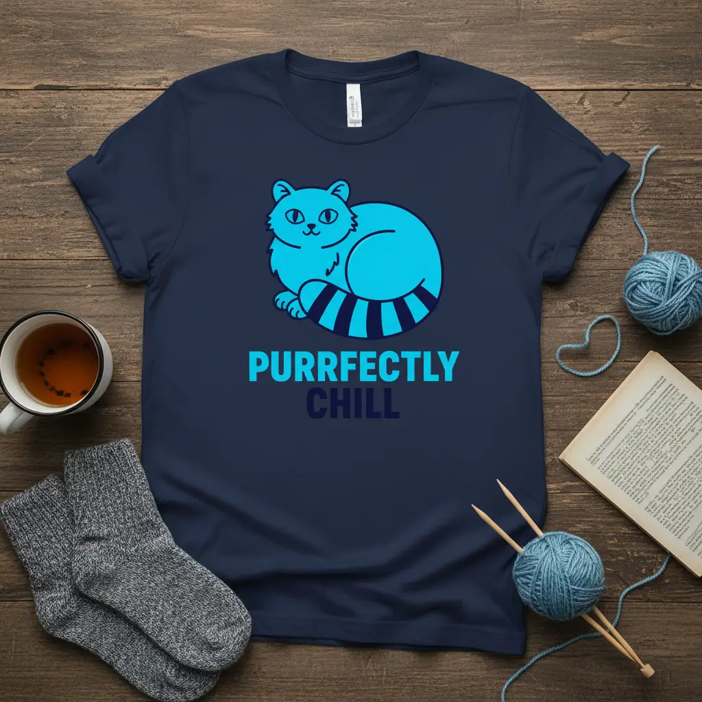 This t-shirt features a delightful cartoon cat, rendered in a vibrant blue, perfectly embodying a state of ultimate relaxation. The text “Purrfectly Chill” is emblazoned beneath the graphic in a complementary shade of blue, creating a cohesive and eye-catching design. It’s an ideal way to showcase your love for cats and your appreciation for a stress-free lifestyle. The overall aesthetic is playful yet serene, making it a versatile addition to any casual wardrobe. This design is a testament to the simple pleasures in life, much like a contented cat.