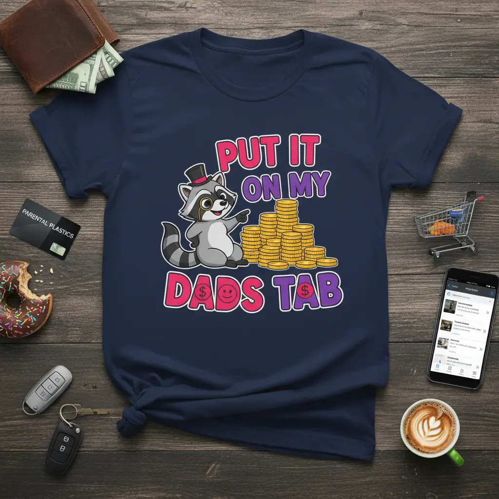 Put It On My Dads Tab! This phrase perfectly captures the spirit of a generous and loving father who’s always there to cover the expenses. Our t-shirt design brings this popular saying to life with a whimsical raccoon character and a pile of shiny coins. It’s a fantastic way to celebrate Father’s Day, birthdays, or just to show appreciation for the dad who always has your back. The playful design is sure to bring a smile to anyone’s face, making it a standout addition to any casual wardrobe.