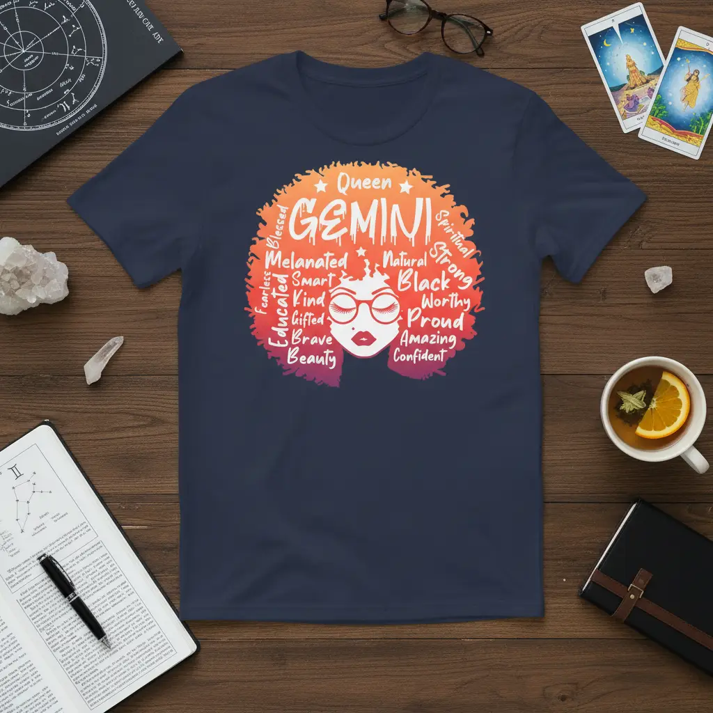 Queen Gemini Melanated Smart Black Worthy Proud Amazing Confident Spiritual Strong Natural Blessed represents the multifaceted essence of this dynamic zodiac sign. This design captures the spirit of a powerful woman, embodying intelligence, resilience, and grace. It’s a celebration of identity, heritage, and the unique qualities that make a Gemini queen shine. The vibrant colors and empowering words create a wearable statement of pride and self-assurance, perfect for anyone who resonates with the Gemini energy.