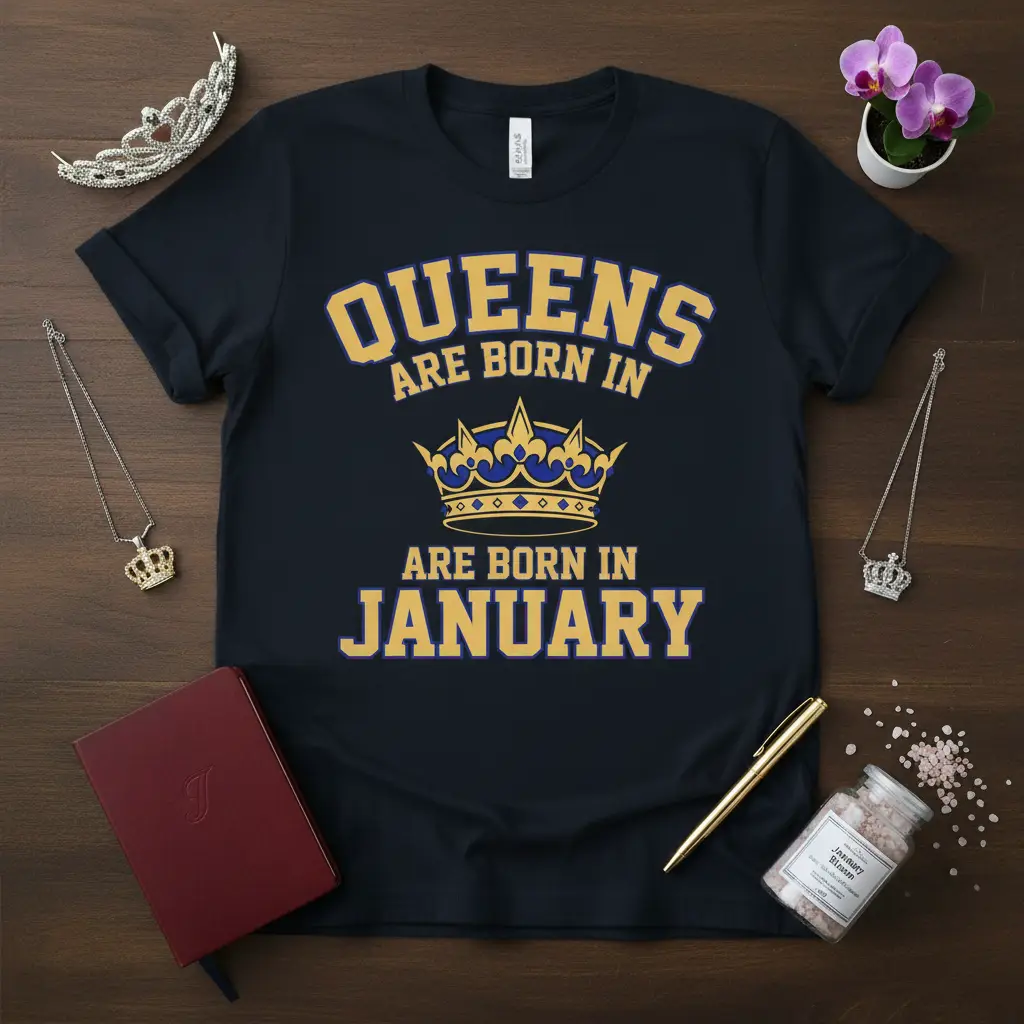 Pick from Black, Navy, Royal, Dark Heather, Red, and White to match your mood and wardrobe staples. Each colorway keeps the Queens Are Born In January design clear and photo-ready for everyday wear.