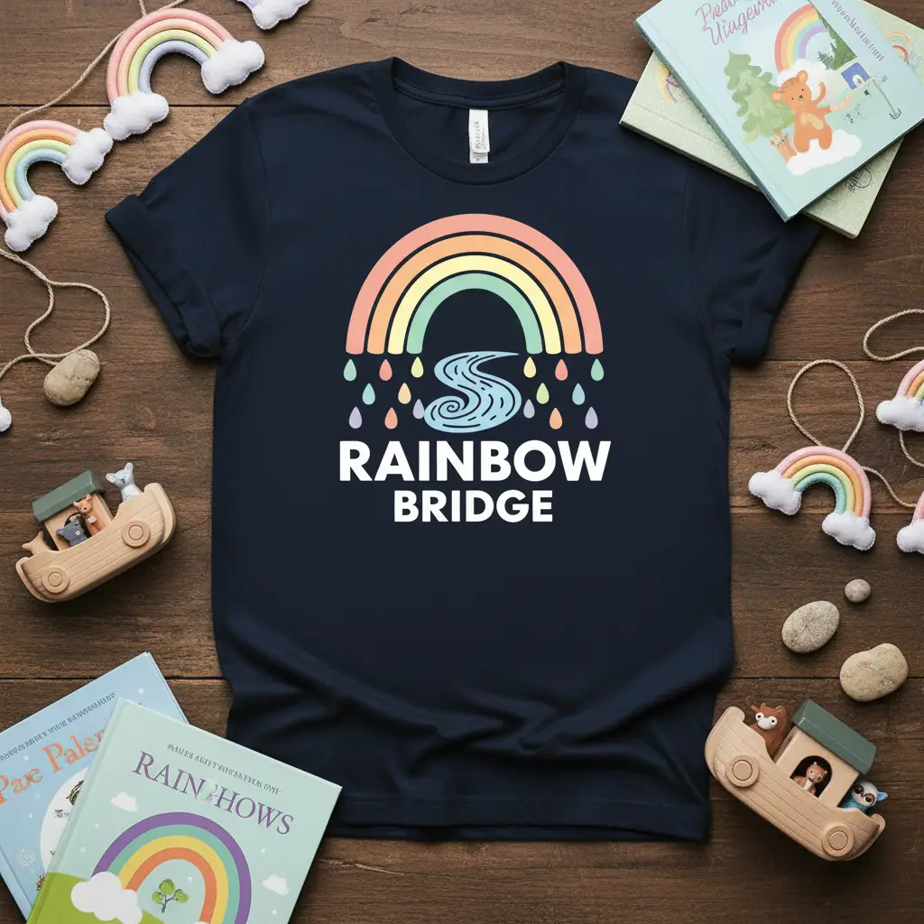 The Rainbow Bridge T-Shirt is designed to provide a sense of peace and connection to those mourning the loss of a cherished pet. The artwork features a soft, pastel-colored rainbow gracefully arching over a serene blue water element, with delicate raindrops adding to the whimsical yet comforting imagery. This visual narrative evokes the promise of a peaceful reunion and the everlasting love shared with our animal companions.
