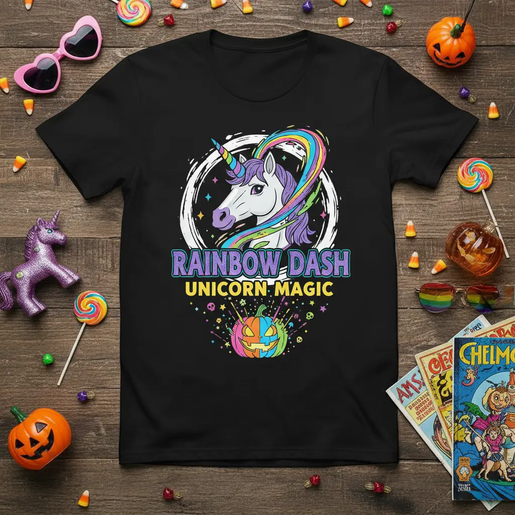 This unique t-shirt features the eye-catching phrase “RAINBOW DASH UNICORN MAGIC,” designed to capture the imagination of unicorn enthusiasts and Halloween fans alike. The central graphic showcases a majestic unicorn with a flowing rainbow mane, set against a dynamic circular background filled with stars and confetti. It’s a design that embodies joy, fantasy, and the thrill of the season.