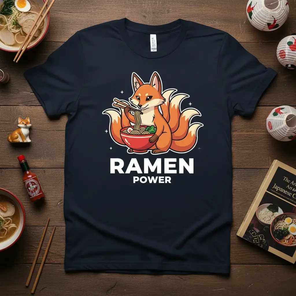 The centerpiece of this tee is an utterly adorable fox, complete with multiple fluffy tails, skillfully enjoying a bowl of ramen. This charming character brings a playful and whimsical element to the design, making it stand out. The combination of the cute fox and the “RAMEN POWER” text creates a unique visual narrative that resonates with fans of anime and Japanese culture.