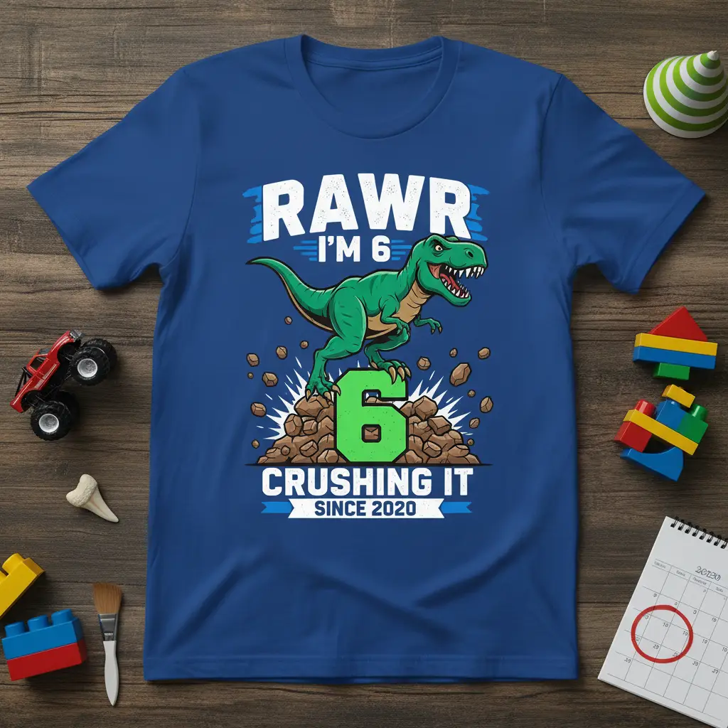 This “Rawr I’m 6 Crushing It Since 2020” t-shirt is more than just apparel; it’s a celebration of your child’s journey and their exciting sixth birthday. The design captures the energy and spirit of a growing child, making it a perfect memento of this special age. It’s crafted for comfort and durability, ensuring it can keep up with all their birthday adventures and beyond. Grab this awesome dinosaur birthday shirt today and make their celebration roar-some!