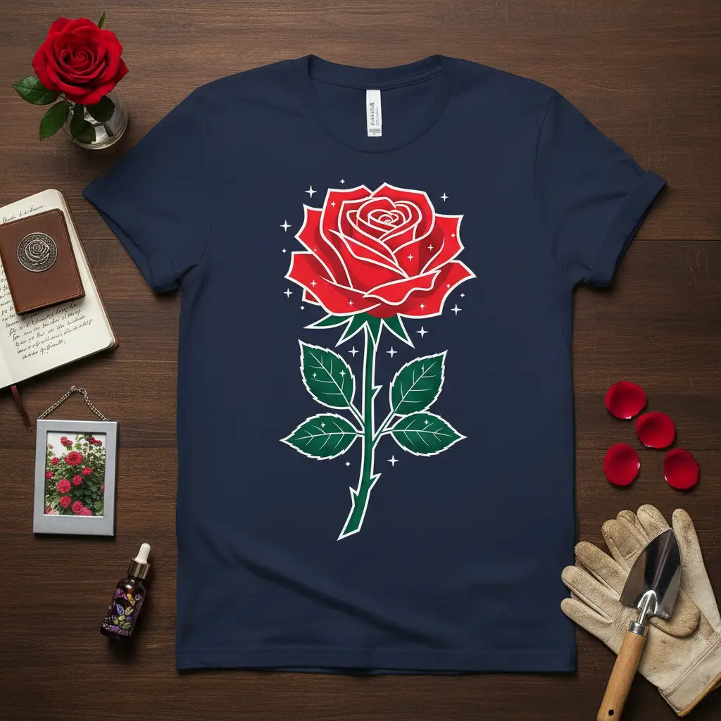Red Rose Graphic Tee designs are a beautiful way to express your love for nature and classic aesthetics. This particular t-shirt showcases a vibrant, detailed depiction of a red rose, complete with lush green leaves and a stem, all outlined with a crisp white border and subtle sparkling accents. It’s an elegant statement piece that brings a touch of the garden into your everyday wardrobe, perfect for those who appreciate the timeless allure of flowers and botanical art. This tee offers a comfortable fit and a striking visual that is sure to turn heads.
