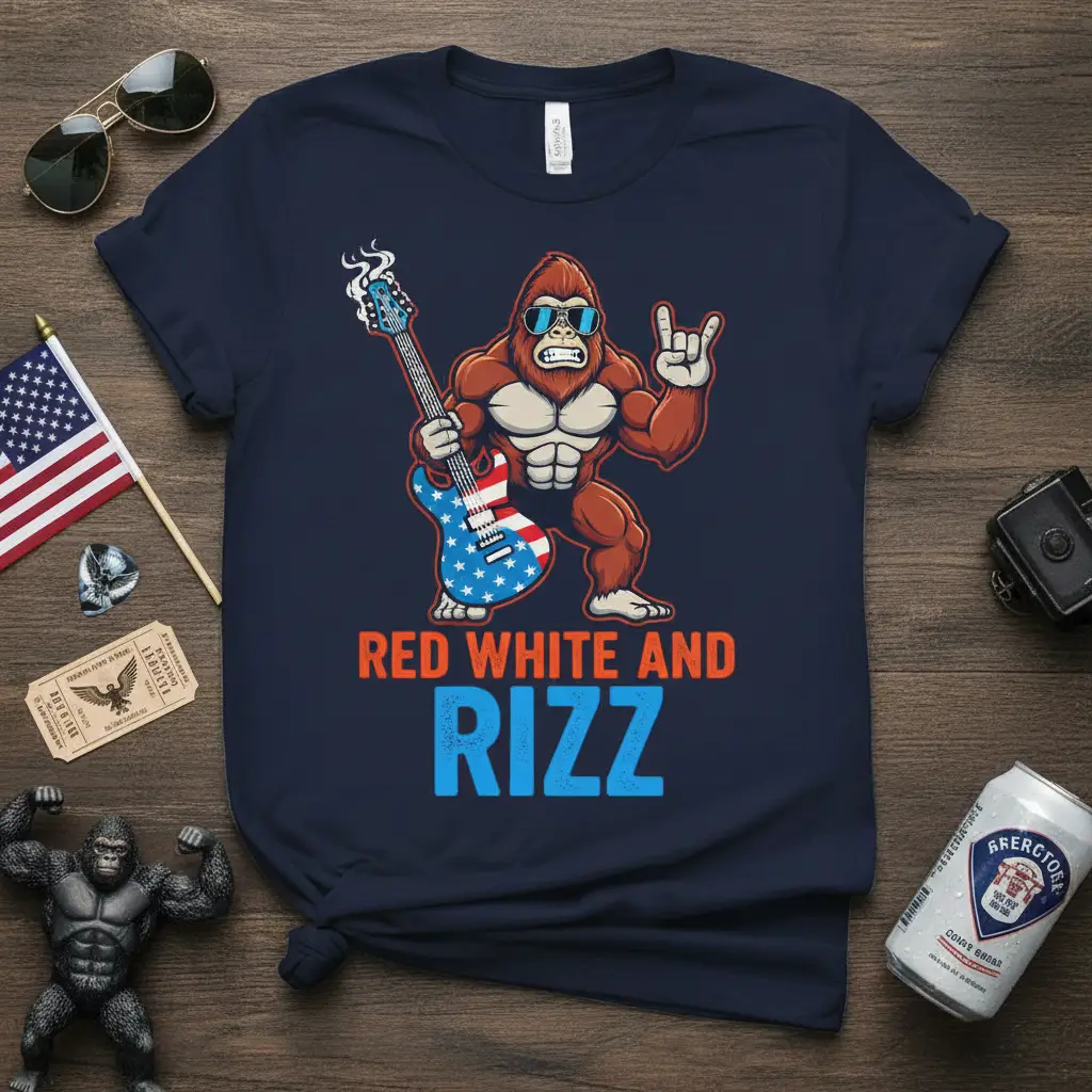 RED WHITE AND RIZZ—this phrase perfectly encapsulates the energetic and patriotic spirit of this unique t-shirt design. It’s more than just apparel; it’s a statement piece for anyone who loves America, enjoys rocking out, and has that undeniable charisma. The design features a powerfully built gorilla, exuding confidence as it shreds an electric guitar adorned with the iconic stars and stripes of the American flag. This t-shirt is crafted for those who want to celebrate national holidays with flair or simply showcase their bold personality. It’s an excellent choice for making a memorable impression at any gathering, from backyard barbecues to music festivals.