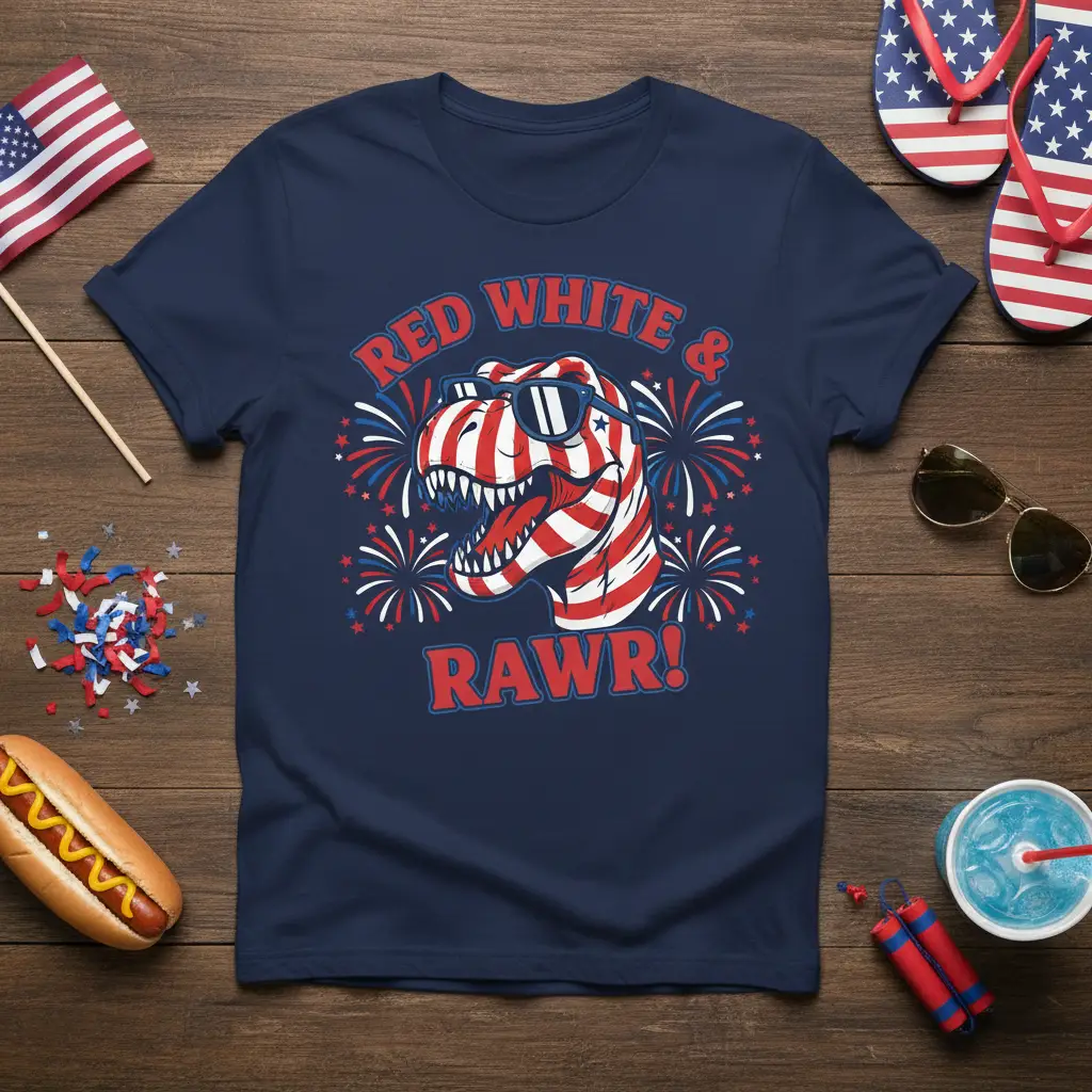 RED WHITE & RAWR! This t-shirt is the ultimate way to showcase your patriotic spirit with a prehistoric twist. Perfect for Independence Day celebrations, BBQs, fireworks displays, or just expressing your love for America and dinosaurs, this tee combines fun, style, and national pride. Its eye-catching design is sure to be a conversation starter at any summer gathering. Wear it proudly and let your inner dinosaur roar this 4th of July!