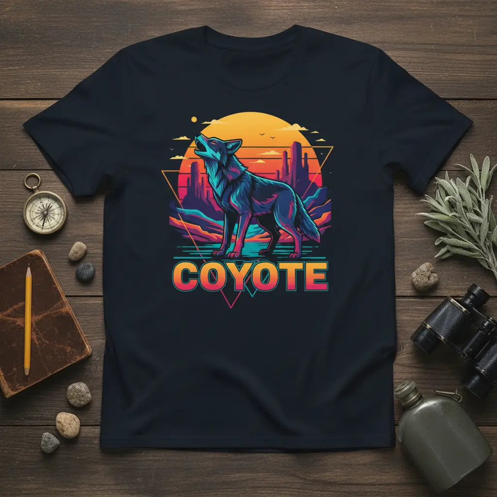 The design draws inspiration from the iconic aesthetics of the 1980s, with its bold colors, geometric elements, and sunset gradients. This retro vibe gives the coyote graphic a modern yet nostalgic feel, making it a versatile addition to any wardrobe. The interplay of light and shadow on the coyote’s form adds depth and character, highlighting its powerful silhouette against the luminous sky. It’s a perfect fusion of natural imagery and artistic interpretation.