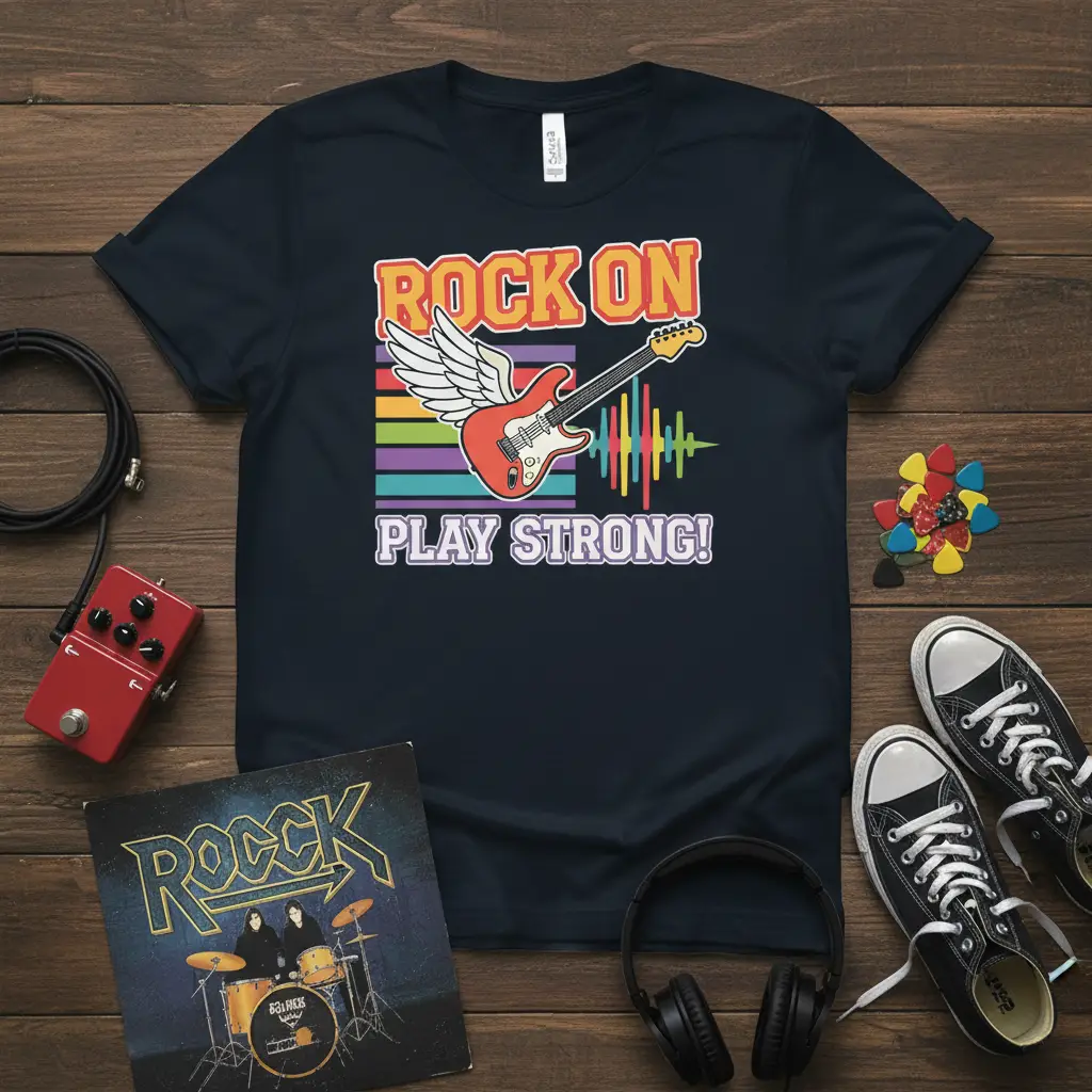Don’t miss out on this opportunity to own a piece of wearable art that celebrates the heart of rock music. The “Rock On Play Strong!” t-shirt is more than just clothing; it’s a declaration of your passion and commitment to the art of guitar playing and rock anthems. Its unique design and comfortable fit make it an essential addition to any music lover’s wardrobe. Order yours today and let your musical spirit shine brightly, inspiring yourself and everyone around you to always rock on and play strong!
