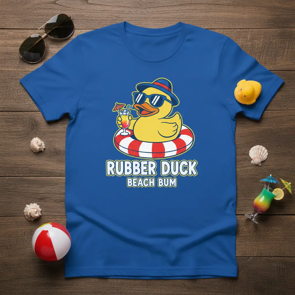 Dive into summer fun with the vibrant and playful RUBBER DUCK BEACH BUM T-Shirt. This eye-catching design is perfect for anyone who loves to embrace the sunshine and enjoy a relaxed vacation vibe. Featuring a cool, sunglasses-wearing rubber duck ready to hit the beach, this tee is sure to bring smiles and compliments wherever you go. It’s more than just a t-shirt; it’s a declaration of your love for summer, relaxation, and all things beachy. Get ready to make a splash with this unique and fun addition to your warm-weather wardrobe.