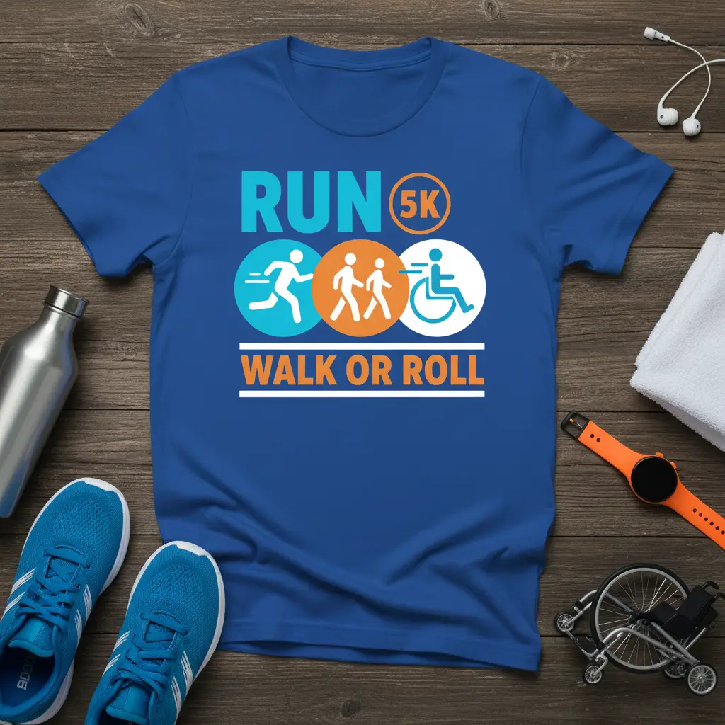 This unique design proudly displays the message “RUN 5K WALK OR ROLL,” making it a perfect statement piece for athletes and advocates alike. The graphic elements visually represent different ways people engage in physical activity, from sprinting to using a wheelchair. It’s a fantastic way to spread awareness and promote the idea that everyone should have the opportunity to participate and be celebrated in sports and fitness events.