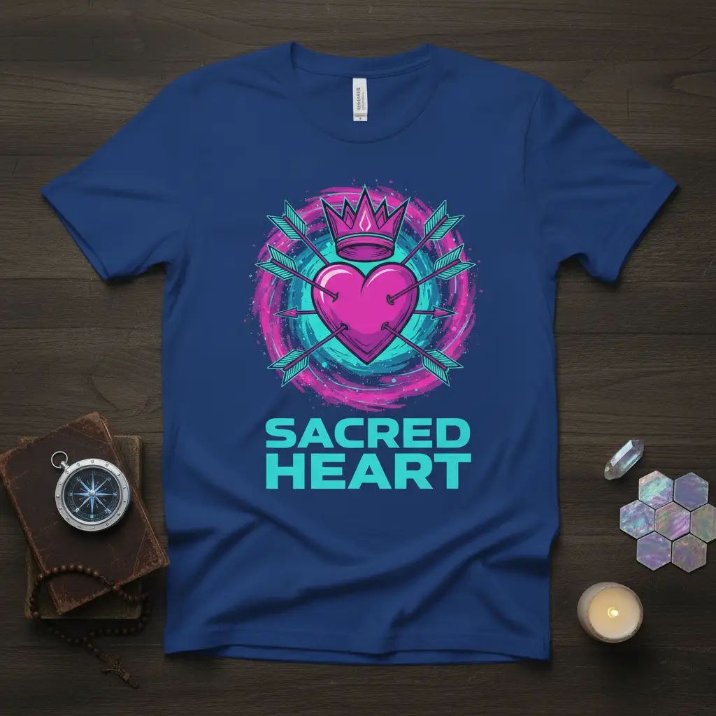 Sacred Heart T-Shirt designs offer a profound way to express deep spiritual beliefs and personal devotion. This particular t-shirt showcases a vibrant, stylized heart crowned and encircled by arrows, a powerful symbol often associated with divine love and sacrifice. The striking visual is complemented by bold lettering, making a clear statement of faith. It’s more than just apparel; it’s a wearable testament to one’s spiritual journey and connection to higher powers. This tee is designed to resonate with individuals seeking meaningful clothing that reflects their inner convictions.