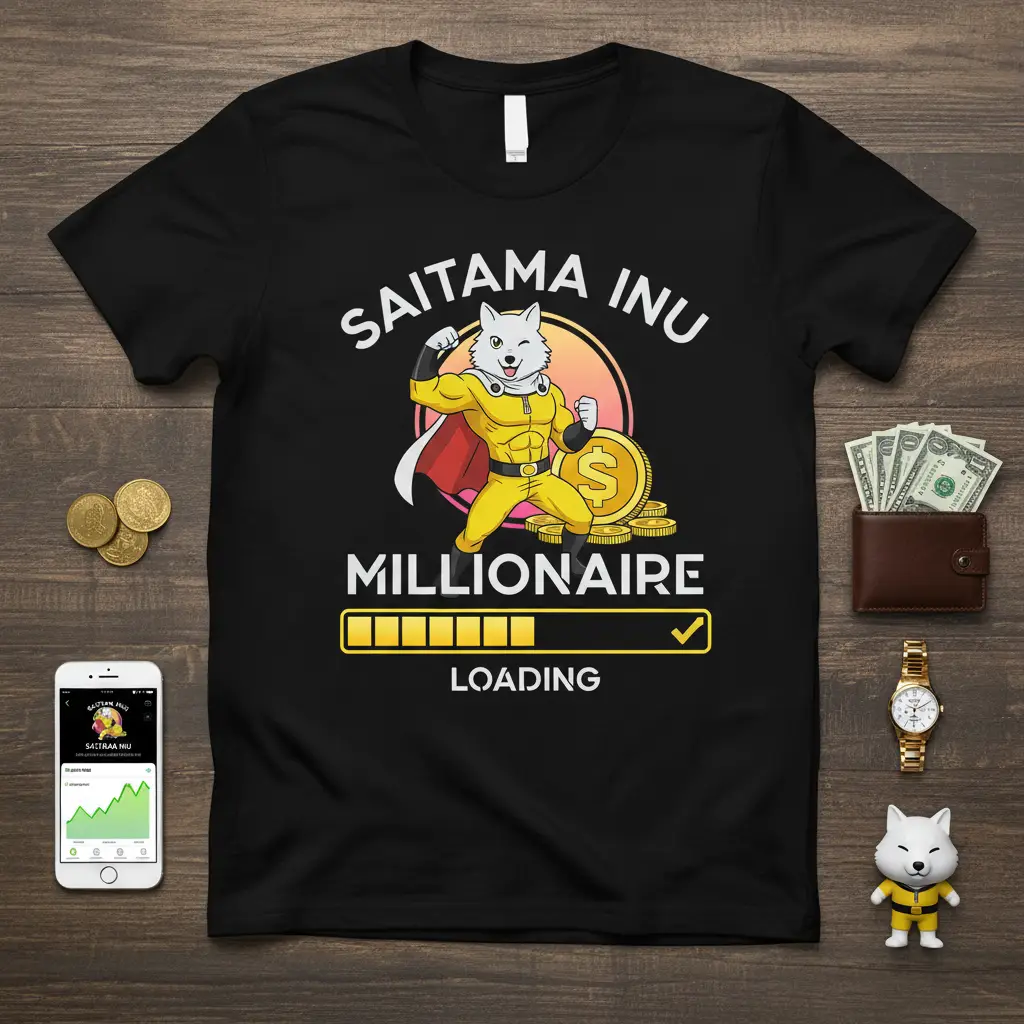 Saitama Inu Millionaire Loading design captures the aspirational spirit of crypto investors aiming for financial freedom. This unique t-shirt is perfect for anyone who believes in the potential of Saitama Inu coin and is on their path to becoming a millionaire. The graphic features a playful dog character in a superhero costume, symbolizing strength and the pursuit of wealth. It’s a conversation starter and a statement piece for the modern crypto enthusiast. Embrace your journey and wear your ambition proudly with this striking design.