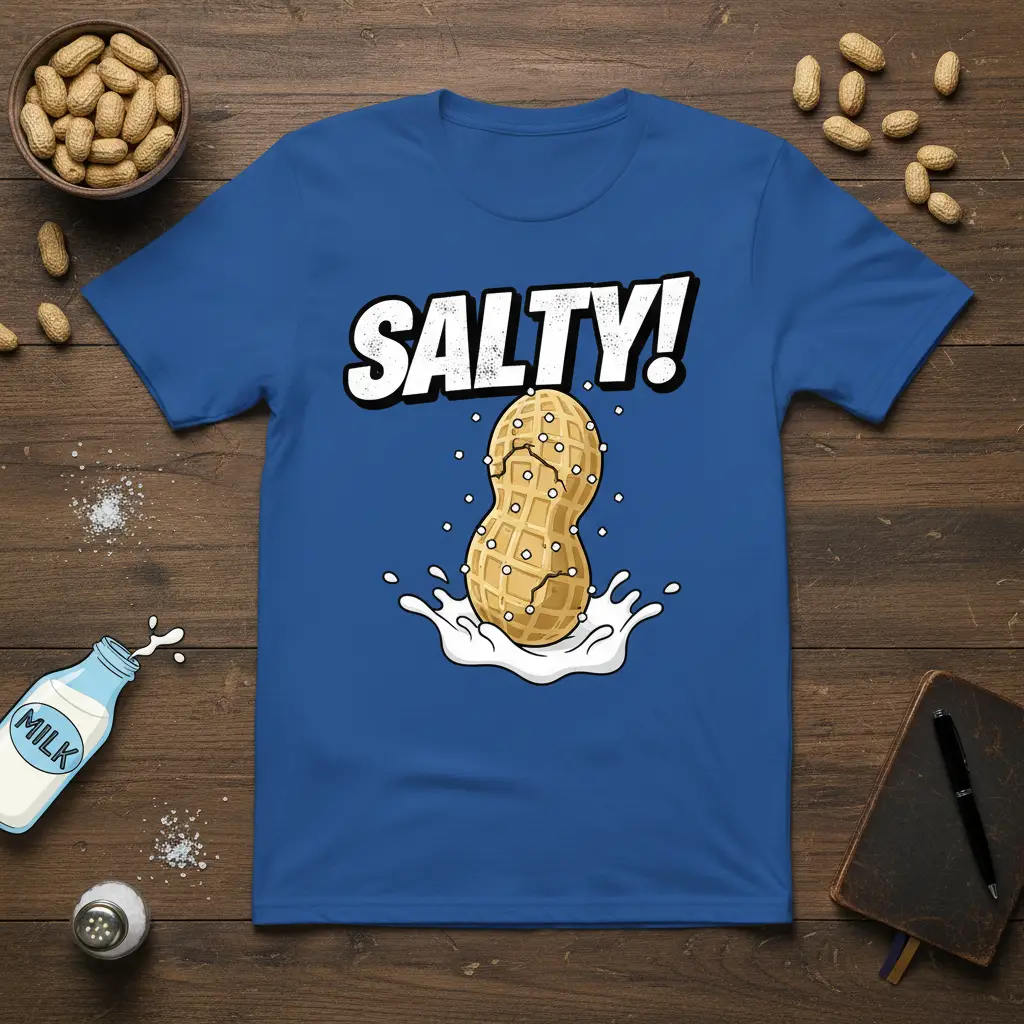 SALTY! This iconic phrase, now emblazoned on a comfortable tee, captures a relatable feeling with a humorous twist. Perfect for those who understand the simple joy of a salty snack paired with a cool drink, this shirt is more than just apparel; it’s a statement of personality. The design features a playfully illustrated peanut mid-splash in milk, surrounded by a scattering of salt particles, all under the bold declaration “SALTY!”. It’s a conversation starter that appeals to foodies, pun enthusiasts, and anyone with a sense of humor.