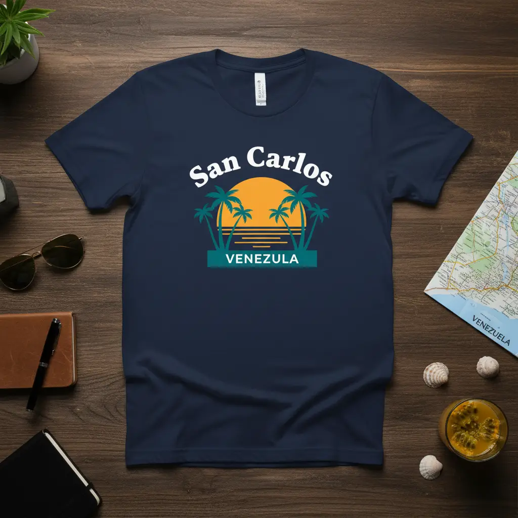 The design masterfully blends the iconic imagery of a tropical sunset with the specific charm of San Carlos, Venezuela. Palm trees sway gently, reflecting on calm waters under a radiant sun, all framed by the distinct text “San Carlos” and “VENEZUELA.” This visual narrative transports you directly to the sun-drenched coasts and vibrant atmosphere that make this region so captivating. It’s a perfect piece for anyone looking to express their wanderlust and love for unique destinations.