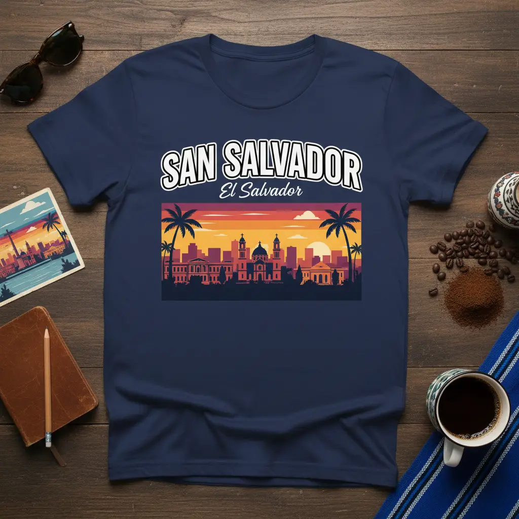 San Salvador El Salvador is a city that captivates with its vibrant culture, rich history, and stunning natural beauty. This t-shirt is designed to celebrate the essence of this remarkable capital, featuring its iconic skyline set against a breathtaking sunset. It’s more than just apparel; it’s a wearable piece of art that evokes memories of travel, adventure, and the unique charm of El Salvador’s heart. Whether you’re a seasoned traveler, a proud local, or simply appreciate beautiful cityscapes, this tee is a perfect addition to your wardrobe.