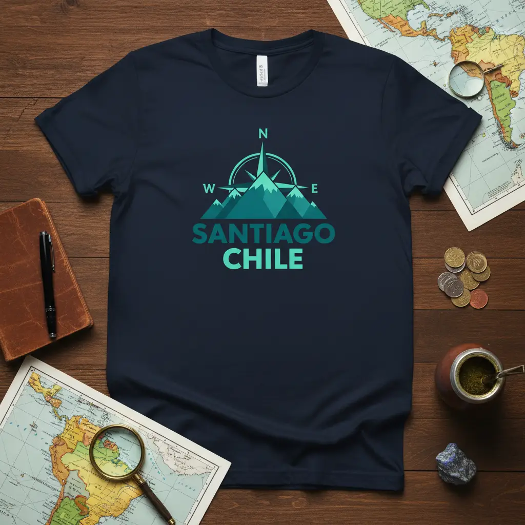 This eye-catching t-shirt proudly displays “SANTIAGO CHILE” in a distinctive gradient of teal and green. The design is enhanced by a stylized compass rose, with a stunning silhouette of the Andes mountains integrated into its core. It evokes the thrill of discovery and the natural beauty that defines this remarkable region.