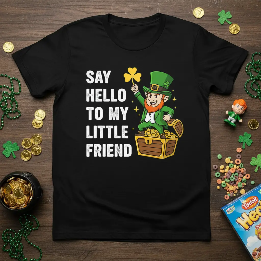 Celebrate St. Patrick’s Day with our fun “Say Hello To My Little Friend” t-shirt, showcasing a playful leprechaun and his treasure. This comfortable and high-quality tee is perfect for parties, parades, or just showing off your festive spirit. It makes an excellent gift for anyone who loves a bit of Irish charm and humor.