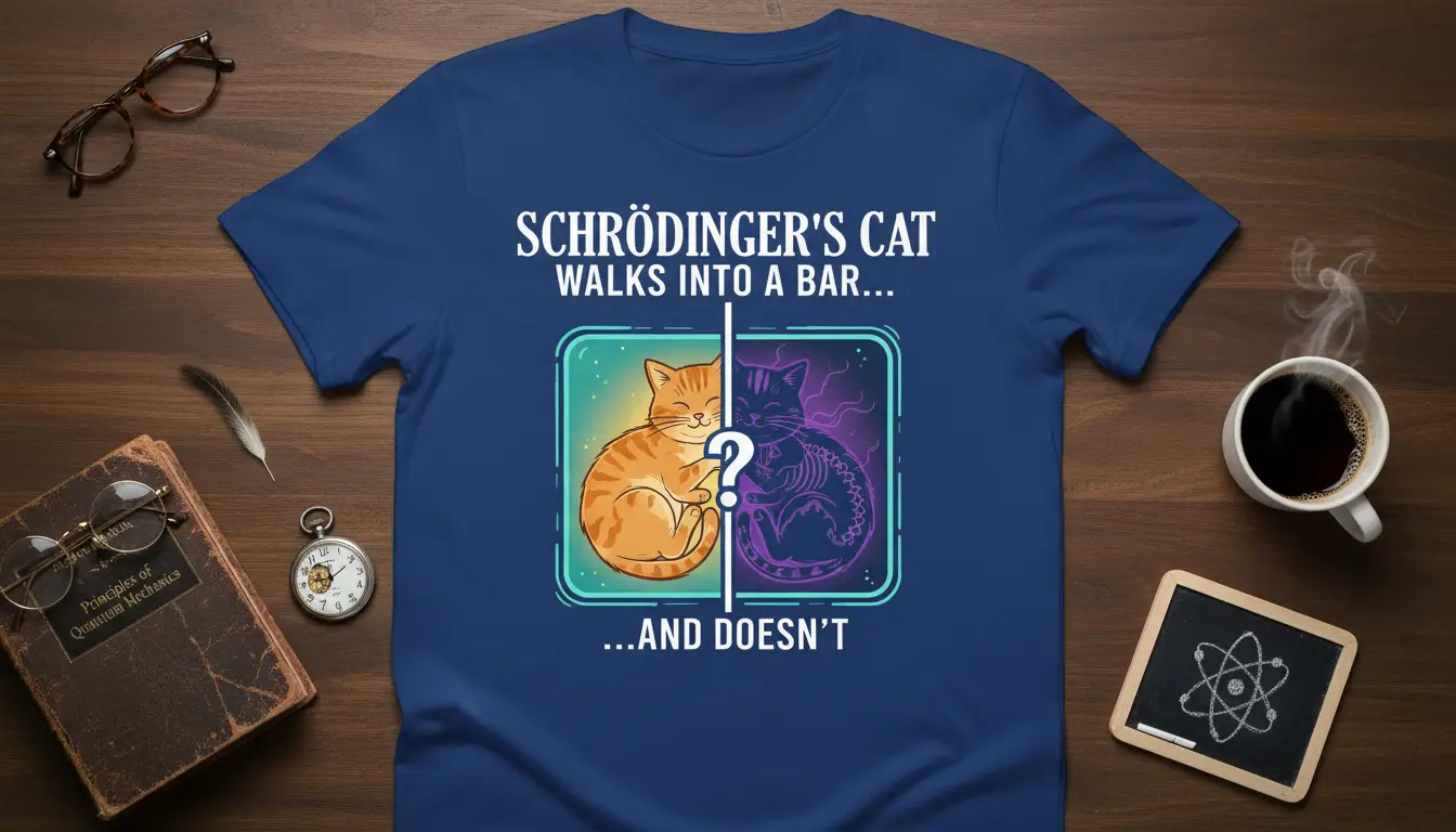 Pick from Black, Navy, Royal, Dark Heather, Red, and White to match your mood and wardrobe staples. Each colorway keeps the Schrödinger’s Cat Walks Into design clear and photo-ready for everyday wear.
