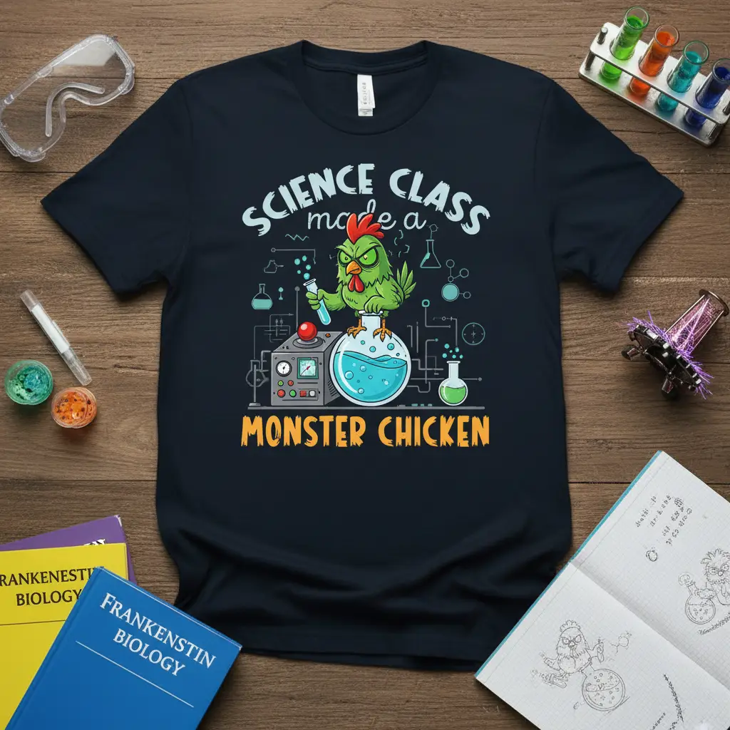The “Science Class Made a Monster Chicken” tee is more than just clothing; it’s a statement of personality. It appeals to those who enjoy a bit of whimsy with their knowledge, merging academic interests with a fun, graphic style. The design is sure to be a hit among friends and colleagues who share a similar sense of humor and a passion for all things science.