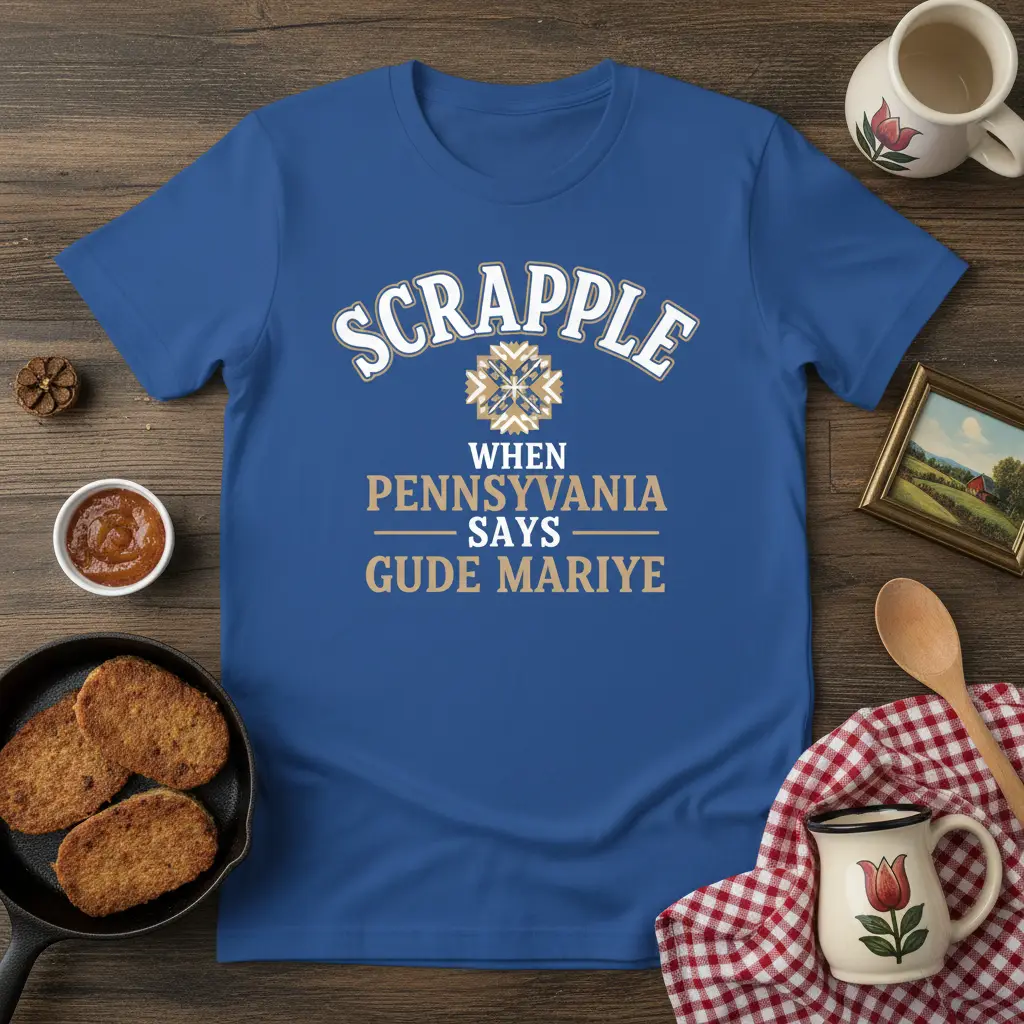 SCRAPPLE WHEN PENNSYLVANIA SAYS GUDE MARIYE is more than just a phrase; it’s a culinary declaration and a nod to the rich cultural tapestry of Pennsylvania Dutch country. This unique t-shirt captures that sentiment perfectly, celebrating the beloved breakfast meat and the charming dialect associated with it. It’s designed for anyone who has a deep appreciation for hearty, traditional meals and the unique sayings that come with them. Wear your heritage with pride or gift this special tee to a fellow enthusiast of all things Pennsylvania Dutch.