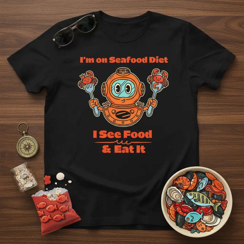 The design features a charming cartoon diver, symbolizing a deep dive into the world of oceanic delights. Accompanied by the memorable phrase, it perfectly encapsulates the feeling of being on a “Seafood Diet” where the only rule is to indulge. It’s a celebration of flavor, fun, and the sheer pleasure that comes with a plate full of your favorite seafood dishes.