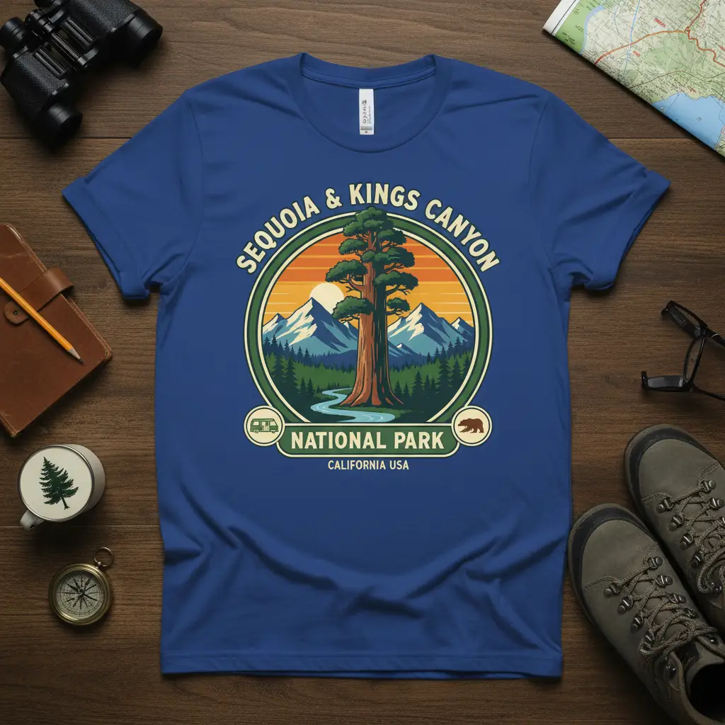 Embark on a visual journey to one of America’s most awe-inspiring natural wonders with our exclusive this design t-shirt. The design beautifully encapsulates the park’s most iconic features, from the colossal sequoia trees that give the park its name to the dramatic mountain ranges that frame the horizon. This apparel is crafted for those who feel a deep connection to the great outdoors and wish to express their passion for exploration and conservation.