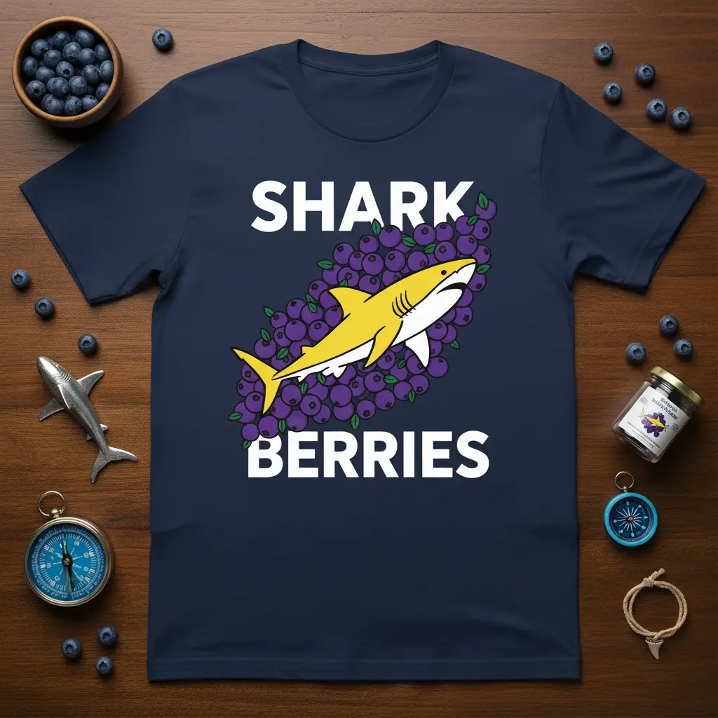 The graphic features a bold yellow shark navigating through a generous cluster of plump purple blueberries. This visual juxtaposition is both striking and amusing, capturing the essence of the “Shark Berries” pun perfectly. It’s a testament to how simple ideas can be transformed into wearable art that brings joy and personality to the wearer and those around them.