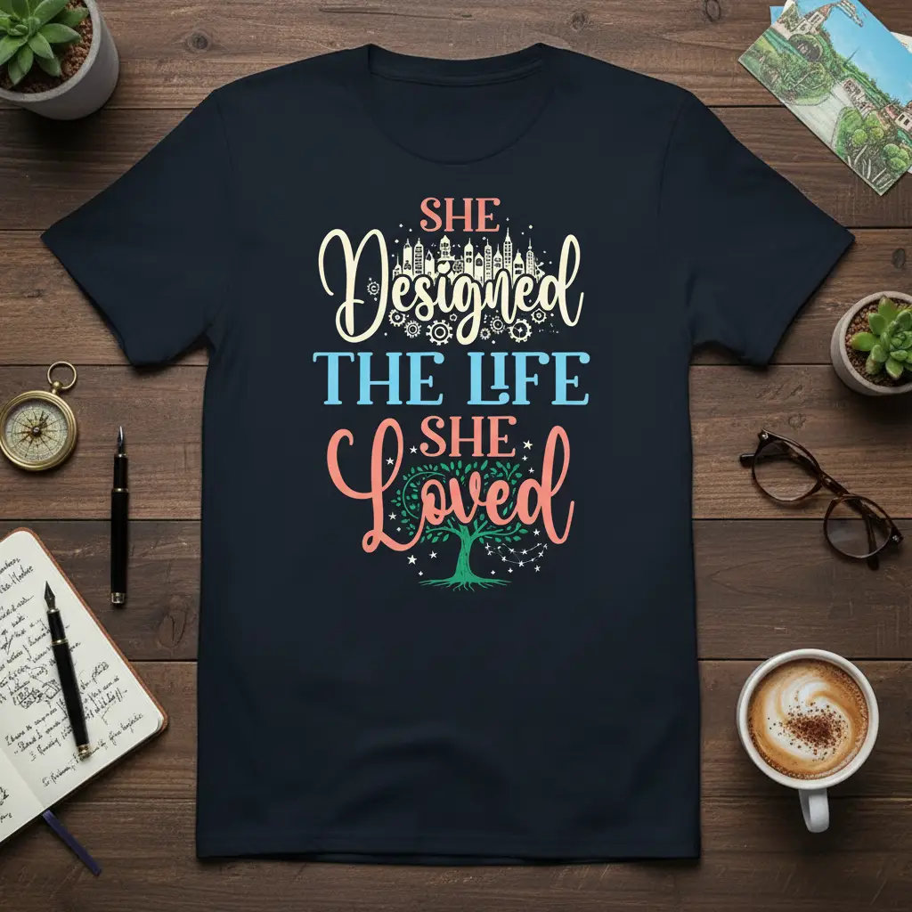 The visual elements complement the empowering message, featuring a stylized cityscape and a lush, vibrant tree. These graphics symbolize the foundations of a well-lived life – community, growth, and the blossoming of dreams. This SHE Designed THE LIFE SHE Loved design encourages wearers to reflect on their journey and acknowledge the effort and intention behind their successes.