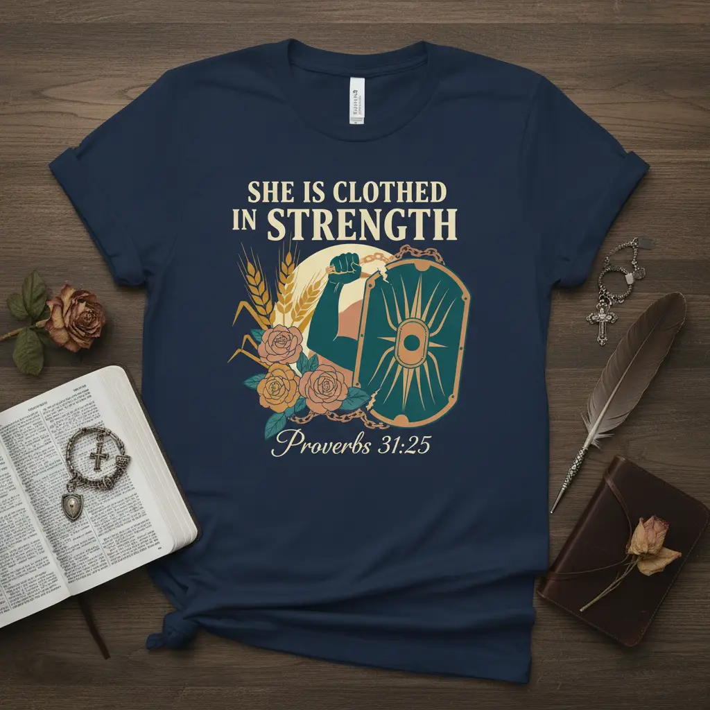 This faith-based T-Shirt prominently features the inspiring scripture “She Is Clothed In Strength Proverbs 31:25.” The design incorporates a powerful image of a muscular arm flexing, holding a Roman-style shield, symbolizing protection and fortitude. Wheat stalks and delicate roses artfully surround the central imagery, representing growth, beauty, and sustenance. It’s a perfect piece of Christian apparel designed to uplift and empower the wearer, resonating with the virtues of the Proverbs 31 woman.
