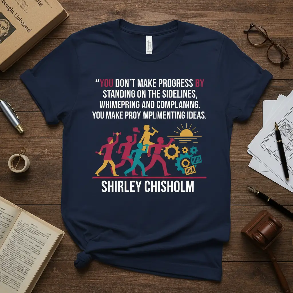 “YOU DON’T MAKE PROGRESS BY STANDING ON THE SIDELINES, WHIMPERING AND COMPLAINING, YOU MAKE PROY MPLIMENTING IDEAS.” SHIRLEY CHISHOLM boldly declares the spirit of action and change. This powerful statement from the trailblazing politician Shirley Chisholm serves as a constant reminder that true advancement comes from proactive engagement and the implementation of innovative ideas, not from passive observation. This design is perfect for anyone inspired by her legacy and committed to making a tangible difference in the world. It’s more than just apparel; it’s a wearable declaration of intent and a tribute to a visionary leader. Embrace the message and wear your commitment to progress proudly.