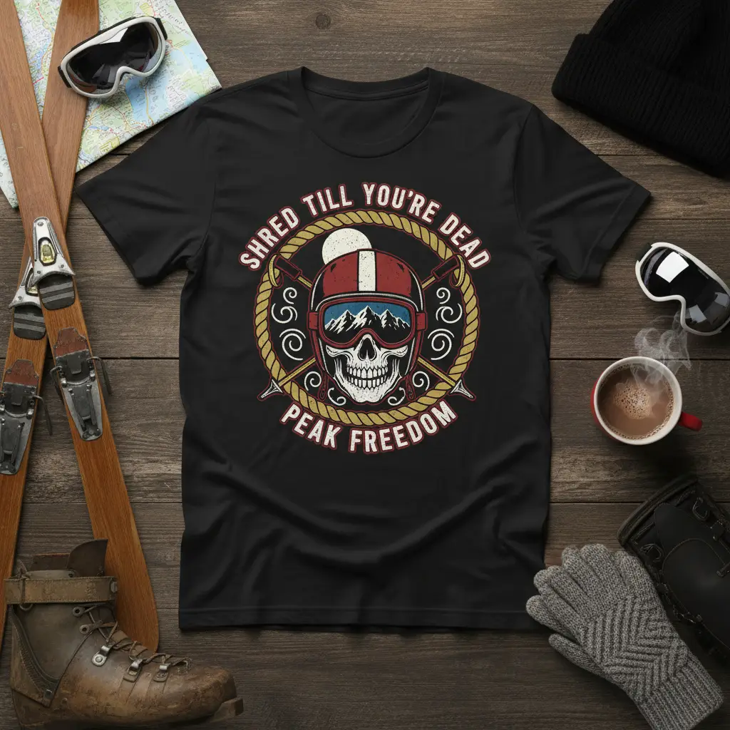 This Shred Till You’re Dead Peak Freedom design serves as a badge of honor for those who brave the cold and seek the ultimate thrill. The striking graphic, featuring a skull in ski gear, symbolizes a fearless approach to the sport. It’s perfect for expressing your deep-seated love for winter sports and the sheer exhilaration of conquering mountain peaks. Whether you’re hitting the backcountry or enjoying groomed runs, this shirt lets you wear your passion proudly.