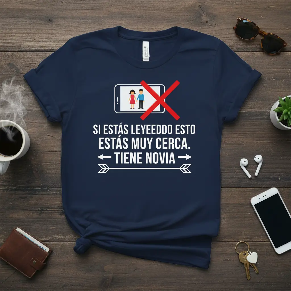 Si Estás Leyeeddo Esto Estás Muy Cerca. ← TIENE NOVIA → This unique t-shirt is designed to bring a smile and a knowing nod to anyone familiar with playful relationship dynamics. It features a bold Spanish phrase that humorously points out a common scenario, making it a fantastic conversation starter. The striking graphic elements, including a crossed-out couple on a phone screen, amplify the message’s impact and charm. This garment is crafted for comfort and durability, ensuring it remains a favorite in your wardrobe for years to come. It’s more than just apparel; it’s a statement piece that embodies wit and a lighthearted approach to life.