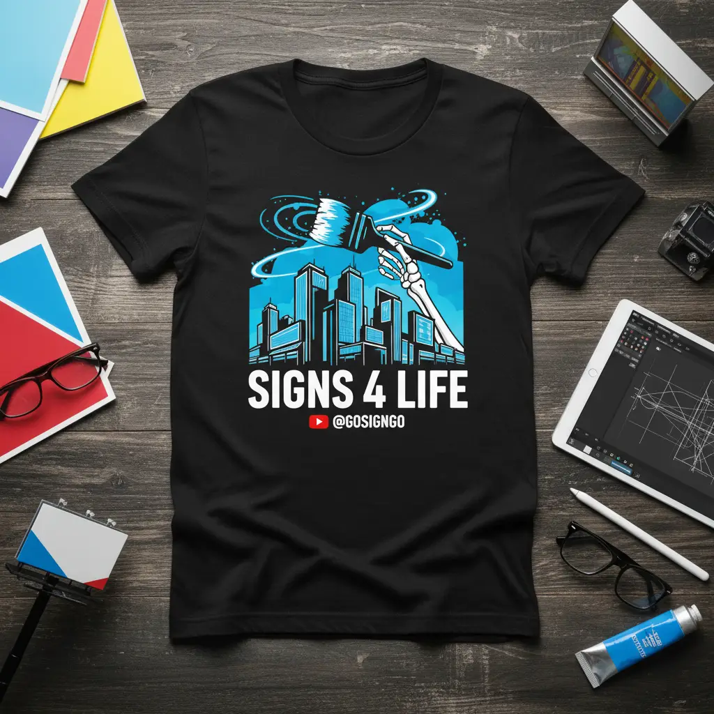 This t-shirt is a perfect representation of the dedication required to excel in fields like sign making and graphic design. The design features a skeleton hand, symbolizing endurance and timeless artistry, painting a dynamic city skyline. This imagery speaks volumes about the effort and vision that goes into building businesses and crafting impactful visuals.