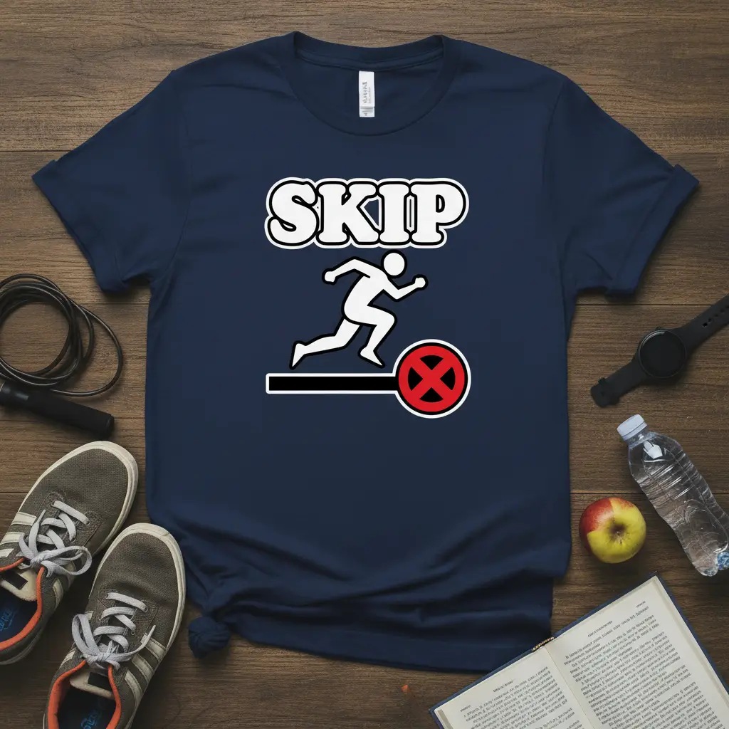 This unique t-shirt features a bold, eye-catching design that’s guaranteed to turn heads. The prominent word “SKIP” is emblazoned at the top, immediately setting a playful and humorous tone. Beneath it, a stylized figure is shown in action, running past a clear “X” symbol, visually representing the concept of skipping out on something. It’s a clever and witty way to express a common feeling among fitness enthusiasts, making it a perfect addition to any casual wardrobe.