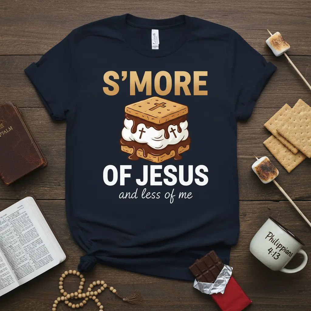 Pick from Black, Navy, Royal, Dark Heather, Red, and White to match your mood and wardrobe staples. Each colorway keeps the S’MORE OF JESUS and design clear and photo-ready for everyday wear.