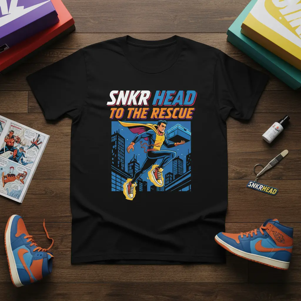 This unique t-shirt design features bold typography that reads “SNKR HEAD TO THE RESCUE,” perfectly complemented by a dynamic superhero graphic. The superhero, depicted mid-leap through a stylized cityscape, carries a shoe box, symbolizing the ultimate quest for the latest or rarest sneakers. It’s a visual representation of the dedication and enthusiasm that defines the sneakerhead community.